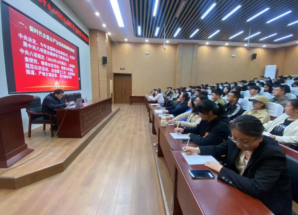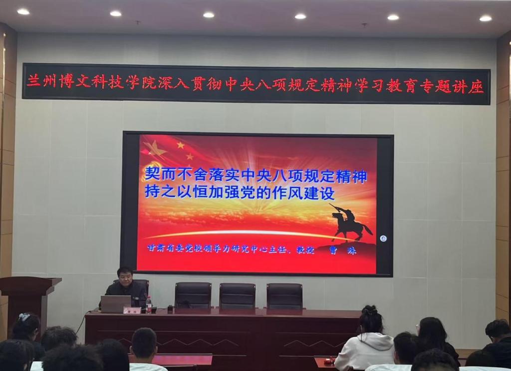 为深入贯彻落实党的二十届三中全会部署,落实省委教育工委关于深入贯彻中央八项规定精神学习教育的部署安排,以作风建设新成效推动保持党的先进性纯洁性,5月8日下午,学校在综合教学楼十二楼报告厅成功举办深入贯彻中央八项规定精神学习教育专题讲座。讲座邀请甘肃省委党校原党史党建教研部主任、甘肃省委党校领导干部领导力研究中心主任、教授曹殊,做了题为《锲而不舍落实中央八项规定精神 持之以恒加强党的作风建设》的学习讲座。各二级学院党委书记、马克思主义学院全体教师、师生党员代表等200余人现场参会。