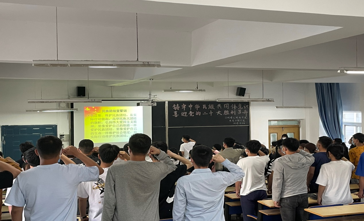 本次活动由电信工程学院学生蔡燚阳主持,活动之初,电信工程学院全体党团学学生干部宣读了民族团结誓词。庄严的誓词表达了同学们在新时代下坚定听党话、跟党走,同心、同行、同向地维护民族团结的决心。其次,学生党员代表袁明鑫和少数民族学生代表田向波分别进行了民族团结演讲,他们用生动的事实,讲述了我国56个民族同呼吸,共命运,共同团结奋斗,共同繁荣发展的历程。讲述了民族团结,是维系中华民族各民族人民共同生活的精神纽带,是支撑中华民族生存发展的精神支柱,是推动中华民族共同走向繁荣富强的精神动力,是中华民族最伟大不朽的灵魂。最后全体学生干部观看了推动民族团结进步主题宣传片。