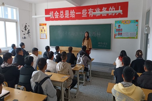 首先,陶老师就此次大会召开的背景向同学们做了介绍,中央委员会总书记习近平代表中央政治局向全会作工作报告,并就《中共中央关于制定国民经济和社会发展第十四个五年规划和二〇三五年远景目标的建议(讨论稿)》向全会作了说明。随后,陶老师表示,作为高校教师,要把学习宣传贯彻党的十九届五中全会精神作为当前重要政治任务抓紧抓好,同“四史”学习教育相互融合互为贯通,推动学习贯彻往深里走,往实里走,取得更好成效。要从风险挑战中增强危机感、从抗“疫”战果中增强自信心、从政策利好中抢抓新机遇,更加自觉地在“两个大局”下辨大势、找方向,准确识变、科学应变、主动求变,坚持用全面、辩证、长远的眼光看待当前的困难、风险、挑战,深刻把握危机共生、危中蕴机、危可转机的辩证关系,善于在危机中育先机、于变局中开新局,抓住机遇,应对挑战,趋利避害,奋勇前进,始终保持战略定力,全面增强必胜信心。最后,陶老师告诫我们,作为当代大学生,我们要保持战略定力,在学习、工作中以解决同学们的实际问题为导向,增强“四个意识”、坚定“四个自信”、坚决做到“两个维护”;思想上始终与党中央保持高度一致。我们要拿出顽强的意志与韧劲,迎难而上、乘风破浪,扎根于专业知识的学习和技能的掌握,为祖国和人民奉献我们的青春力量。