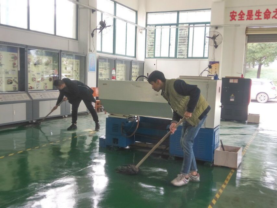 活动伊始,实训基地负责老师陈艳老师给同学们进行了分工安排,在各党小组负责人的带领下,同学们纷纷投入到打扫工作中,一部分学生负责打扫和清洗实训中心的地面和机械设备,另一部分学生戴上手套,拿上扫帚等工具负责清理实训中心周围的地面垃圾,大家热情饱满,不怕脏不怕累。尽管汗流浃背,但同学们依然干劲十足。在大家的共同努力下,经过一个多小时的清扫,第一、第二实训中心都被打扫得一尘不染,实训室内焕然一新。