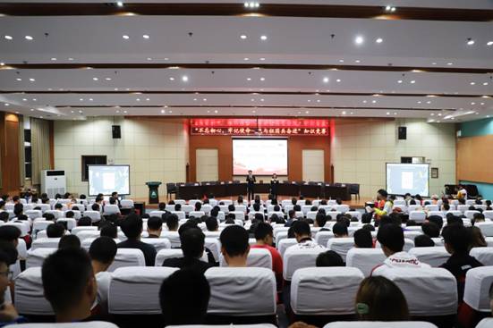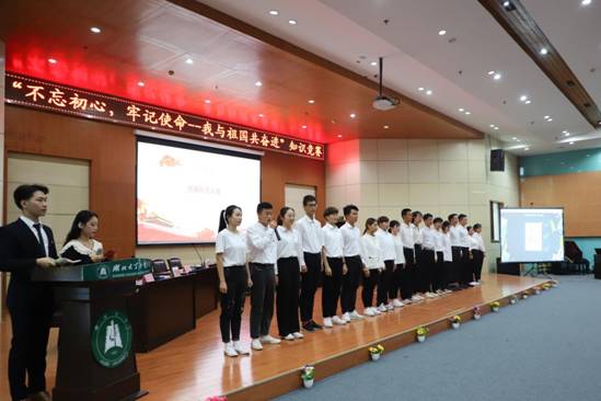10月22日晚6时30分,为贯彻党中央关于“不忘初心,牢记使命”主题教育的要求,推动学生党员深入学习十九大报告和习近平新时代中国特色社会主义思想,由bat365正版唯一官网学生党支部和艺术与设计学院学生党支部联合举办的“不忘初心,牢记使命——我与祖国共奋进”知识竞赛在学术报告中心弘德厅隆重举行。校党委彭德忠书记和部分学校教职工出席本次活动。