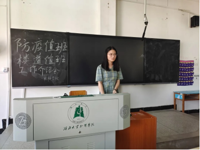 首先由督查组负责人王熙向大家介绍本学期楼道值班工作安排及工作情况,讲解了楼道值班中需要注意的一些纪律事项。其次由分团委副书记杜家璇向大家介绍了校园防疫值班的工作情况及安排,并详细讲解了值班注意事项等。