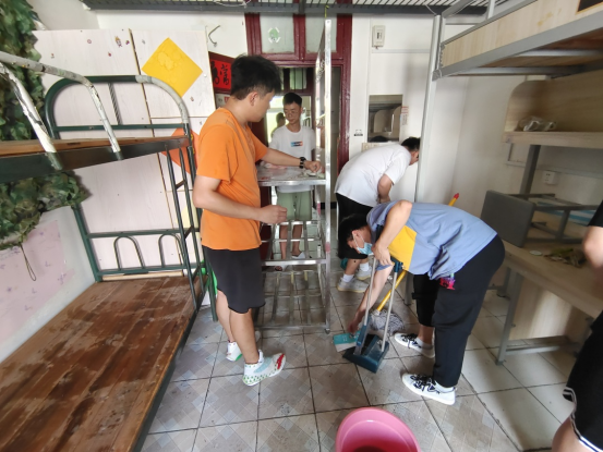 经过前期精心的安排,大家迅速投入到清扫工作中,大家分工明确,各司其职。所有人员都手持抹布或拖把投入到寝室卫生打扫当中,对宿舍门、桌面、床板等每一个角落每一处污垢都认真的清理打扫。经过两个小时的努力,充分发扬不怕脏、不怕苦、不怕累的精神,让新生宿舍环境焕然一新。