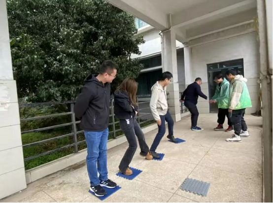 每场分三个组,每个组五个人,根据排队人数依次放行到场地组成队伍,然后各队伍齐心协力过“河”,每组最后一个接力的人根据裁判提出的党史问题回答。在规定时间内完成游戏并答题正确即为获胜。