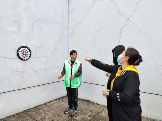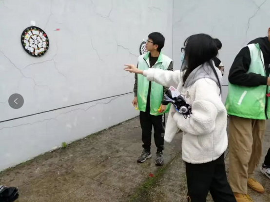指尖抛出的飞镖,在空中划出优美的弧度,稳稳定在转盘上,转盘上对应区域贴着中奖区或党史题目的序号,直接打在中奖区域或答对区域对应题目的提问即为获胜。