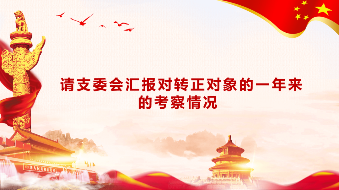 由支委会汇报对申请转正的同志一年来的考察情况;与会党员对申请转正的同志情况进行充分讨论。最后由到会的有表决权的正式党员无记名投票表决。