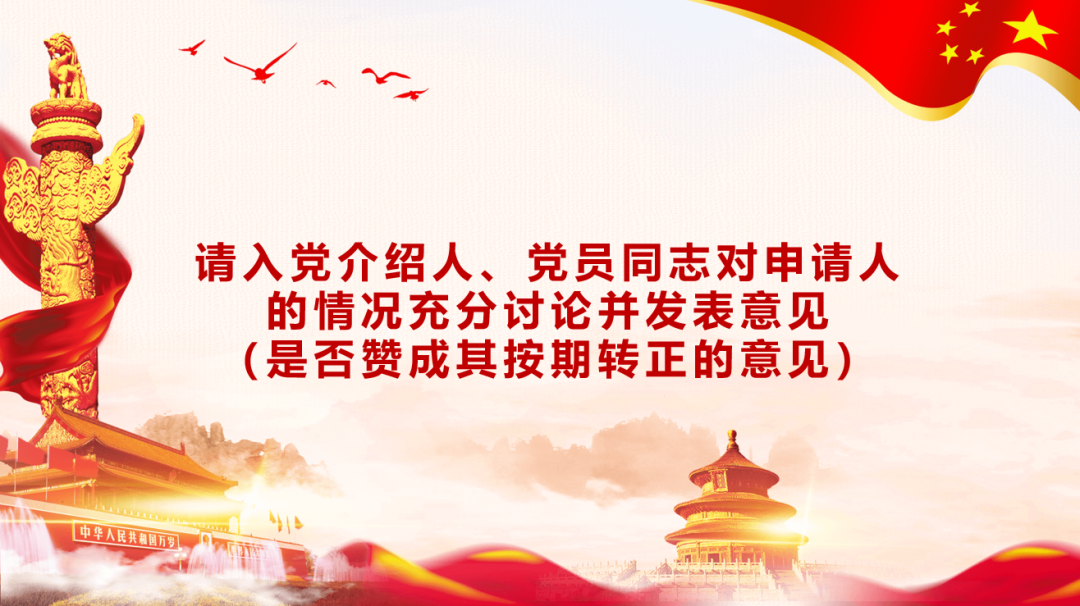 由入党介绍人向大会介绍申请人在这一年的预备期內的政治、思想、学习、工作生活等情况。
