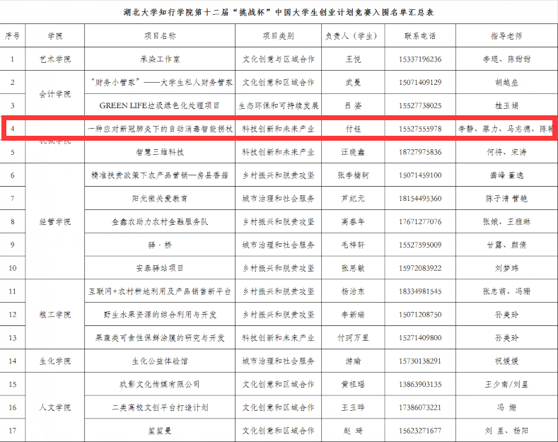 近日,bat365由李静、蔡力、马志德、陈艳四位老师带队参加“第十二届挑战杯中国大学生创业计划竞赛”,其作品《一种应对新冠肺炎下的自动消毒智能拐杖》经过校内专家评审,成功入围复赛。