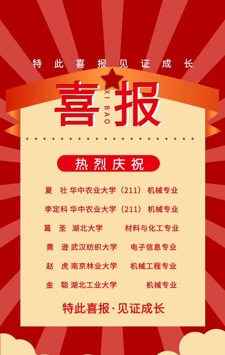 夏壮、李定科两名同学考入国家“211工程”重点建设高校华中农业大学;葛圣同学被湖北大学材料科学与工程学院录取;黄逊同学跨专业报考武汉纺织大学电子与电气工程学院,以总排名第三的成绩被电子信息专业录取;赵虎同学以排名第二的总成绩成功考入南京林业大学;金聪同学成功考取湖北工业大学,且在初试中专业课取得127分的优异成绩,跻身学校前五名。特此报喜!