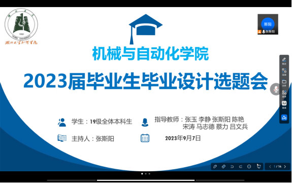 9月7日下午,学院在知真楼218教室召开2023届毕业生毕业设计选题会。19级全体本科生参加会议。指导老师张斯阳主持会议。