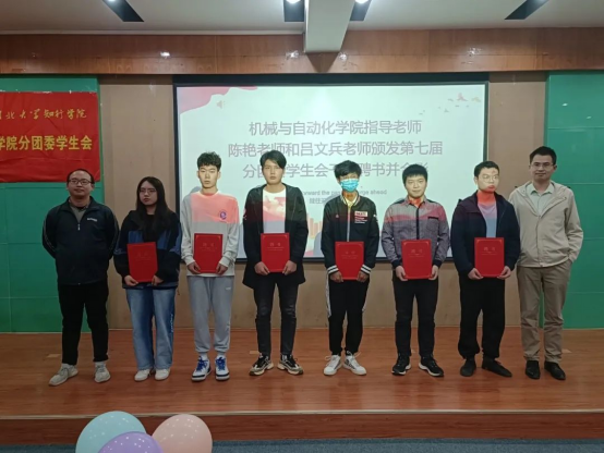 bat365正版唯一官网指导老师陈艳老师和吕文兵老师颁发第七届分团委学生会干部聘书并合影。