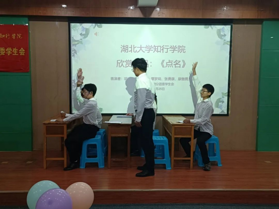 由第八届分团委学生干部带来小品《点名》在搞笑之余他们告诫大家在学校要刻苦向上,努力学习,不要虚度年华。