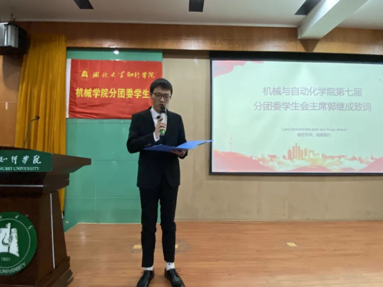 随后bat365正版唯一官网第七届分团委学生会主席郭继成发表致辞。他对上一年的工作进行了概括与总结,他希望新一届分团委学生会能做得更好,同时向干事们发出号召——争做实事,服务同学。