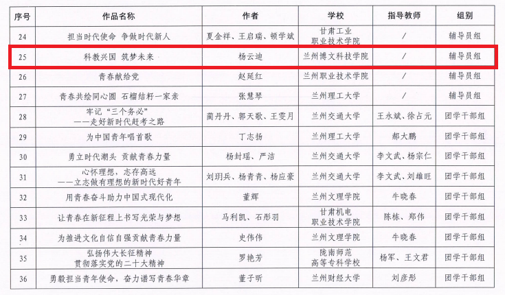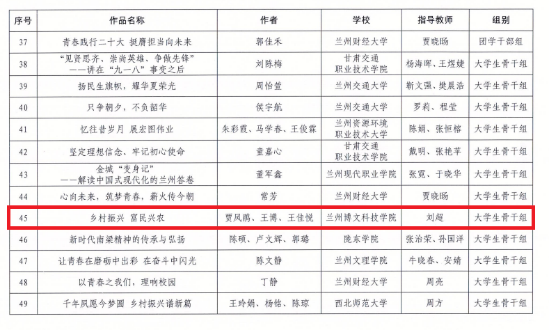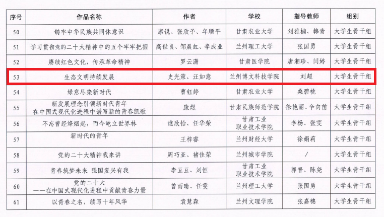 为深入学习贯彻习近平新时代中国特色社会主义思想和党的二十大精神,坚持不懈用党的创新理论铸魂育人,大力培养干部师生理论宣讲骨干,打造富有甘肃教育特色的宣讲品牌,着力培养堪当民族复兴大任的时代新人,近日,由省委宣传部、省教育工委、团省委开展的“理响校园.培根铸魂”全省高校理论宣传作品征集评选展示活动评审结果公示,我校3件作品在此次作品征集评选展示活动中取得佳绩。