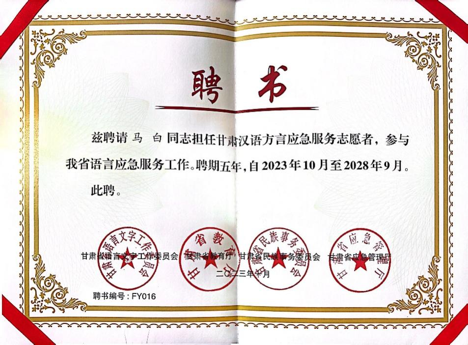 为深入贯彻落实全国、全省语言文字会议精神,切实加强新时代全省语言文字工作,增强语言服务国家和社会的能力,省语委、省教育厅、省民委、省应急管理厅决定组建国家通用手语、甘肃汉语方言及少数民族语言应急服务志愿队。经省语委等部门认真遴选,我校教师马白入选并担任甘肃汉语方言应急服务志愿者。