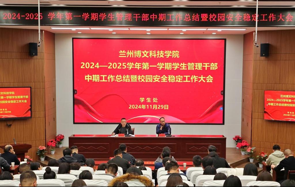 11月29日下午,2024-2025学年第一学期学生管理干部中期工作总结暨校园安全稳定工作大会在北校区综合教学楼12楼报告厅召开,副校长刘德光、学生处全体人员、各学院学生管理副院长、全体辅导员及班主任参加。