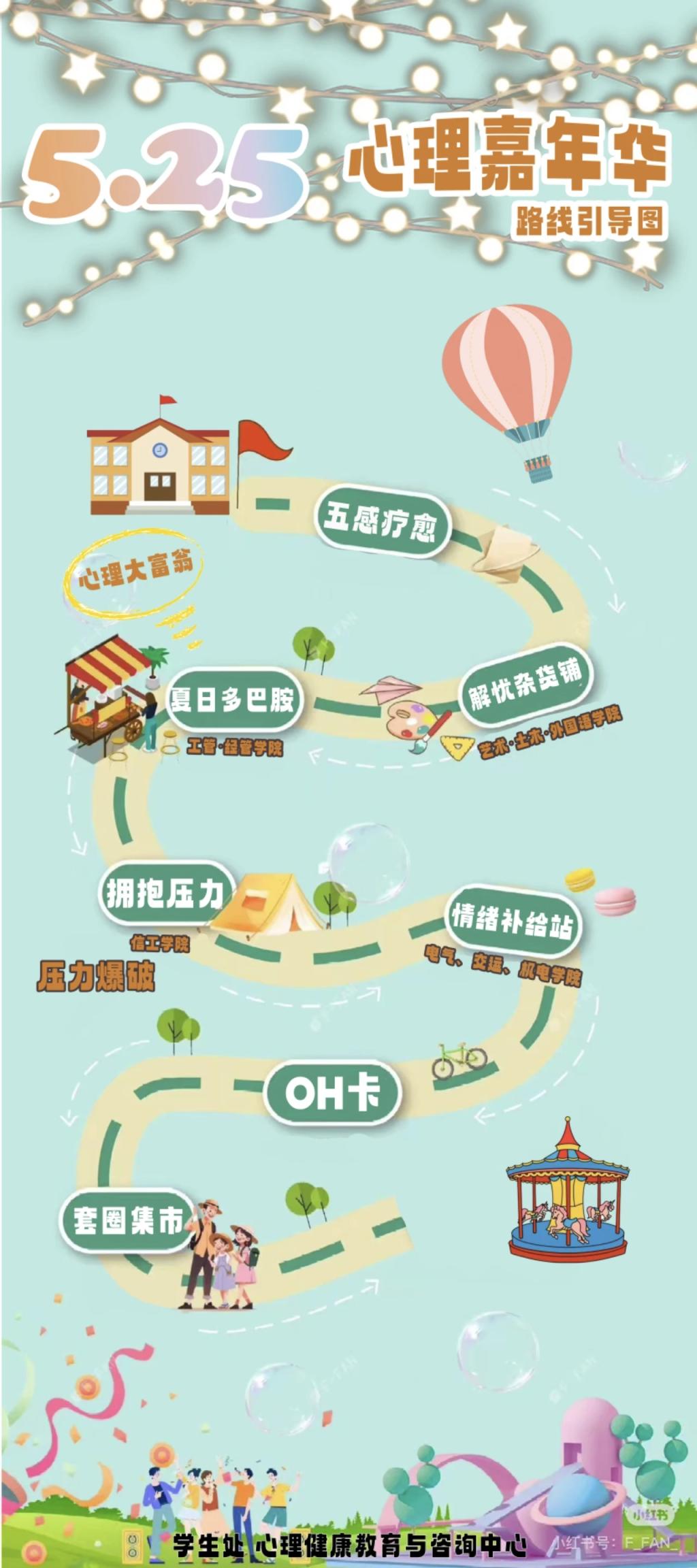 本届心理嘉年华以“心沐暖阳,‘五’忧绽放”为主题,针对大学生的心理特点与需求,通过学生喜闻乐见的形式,从“德智体美劳”五育并举理念为出发点,集沉浸式互动交流、体验育心、解压放松于一体的特色心理教育矩阵,为学生们打造了一场身心放松的“解忧之旅”。