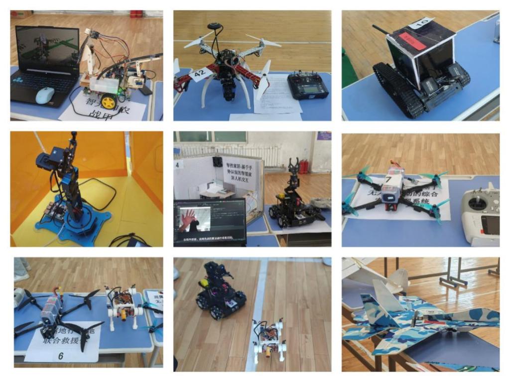 展览现场,科技创新作品涵盖了人工智能、机械设计、电子信息、结构设计、绘画艺术、数字技术等多个领域。其中,智能机械臂,智控家居-基于手势识别的智能家居人机交互,天枢地行-空地联合救援体,通过视频与动画的演示,抓住了学生们的好奇心和求知欲。基于TRIZ理论的无人机林业生态监测系统,智眸π盒-基于AI视觉识别的快递分拣系统,诠释了科技创新的魅力。