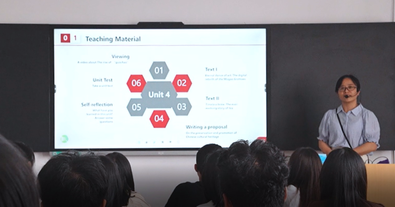 本届大赛以“外语教材的有效使用:讲述中国,沟通世界”为主题,聚焦外语教材的创造性开发与跨文化教学应用,强调通过语言教学传递中国声音、促进文明互鉴。学校团队以《理解当代中国:大学英语综合教程1》第四单元 Cultural Heritage:Tradition and Innovation(《文化遗产:传统和创新》)为参赛内容,巧妙融合教材资源与本土文化元素,设计出兼具语言能力培养与思政育人价值的教学方案。其创新的课堂活动设计、扎实的语言功底及生动的“中国故事”讲述方式,赢得了评委的高度认可。