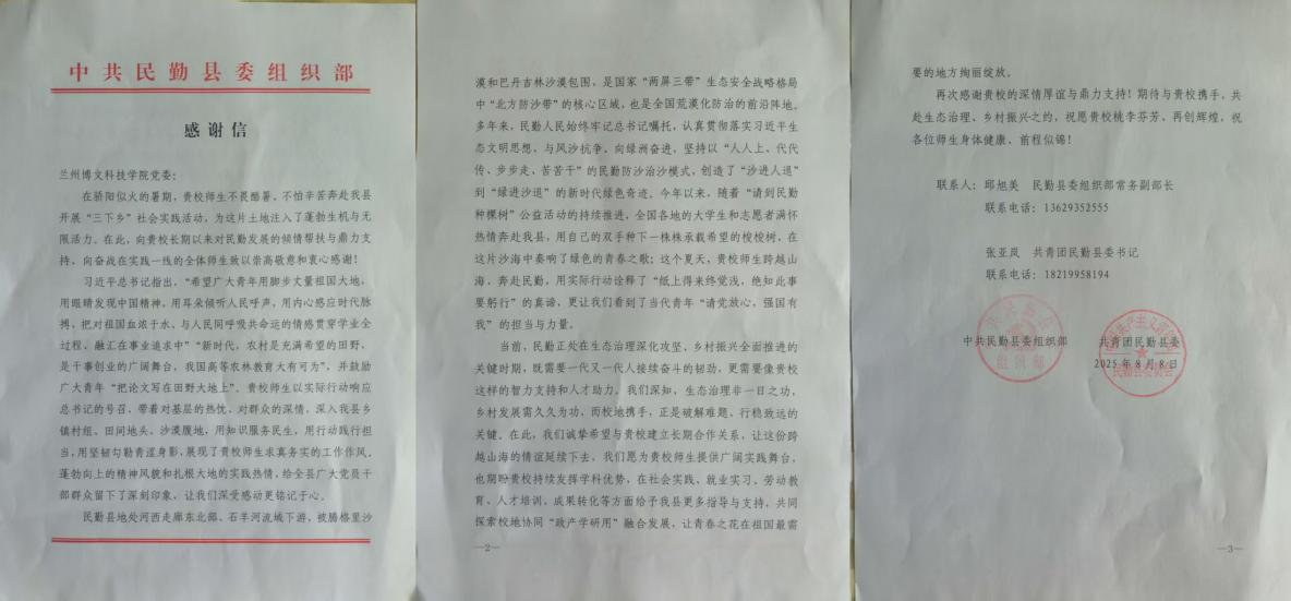在民勤县,师生们践行习近平总书记“把论文写在田野大地上”的指示,顶着酷暑深入乡镇村组、田间地头和沙漠腹地。他们发挥学科专业优势,以“办实事、解难题”为目标开展服务,展现出求真务实、昂扬向上的精神。中共民勤县委组织部、共青团民勤县委在感谢信中称赞师生们“求真务实的工作作风、蓬勃向上的精神风貌和扎根大地的实践热情”,称其解决了基层实际问题,感动了全县党员干部群众。