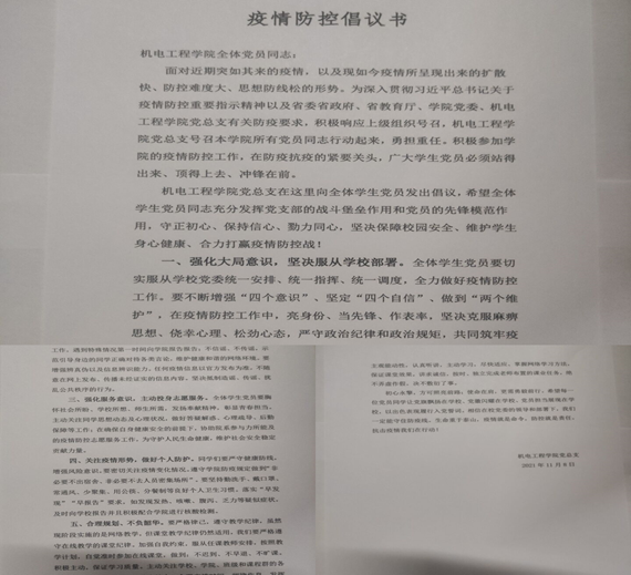 “疫情就是命令,防控就是责任”自疫情开始以来,本院党总支,团总支积极响应校党委,校团委疫情防控的号召,为充分发挥党支部的战斗堡垒作用,共产党员的先锋模范作用,充分发挥“党有号召,团有行动”的优良传统。本院在小高层分别设立了党员先锋岗和团员先锋岗。本院党总支,团总支分别向党员,青年团员发起倡议。希望本院学生党员,青年团团员能够以高度的政治自觉,高度负责的态度,积极行动,本院广大学生党员,青年团员积极行动,主动担当作为,以实际行动诠释担当,贡献力量,担任起了食堂,核酸检测现场的秩序维护员,南校区大门,南北校区中门健康码查询员,学生公寓的物资发放员。切实增强责任感,使命感和紧迫感,共同构筑起疫情防控的钢铁长城,让党旗和团旗在疫情防控一线高高飘扬。