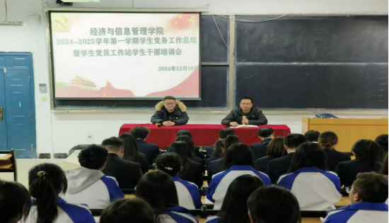 为进一步提高学生干部的工作能力,加强学生干部队伍建设,经济与信息管理学院于2024年12月18日晚在教学楼东T2召开“经济与信息管理学院2024-2025学年第一学期学生党务工作总结暨学生党员工作站学生干部培训会”。本次会议由经济与信息管理学院党委副书记赵磊主持,辅导员谭成杰及学生党员工作站全体成员参加了此次会议。
