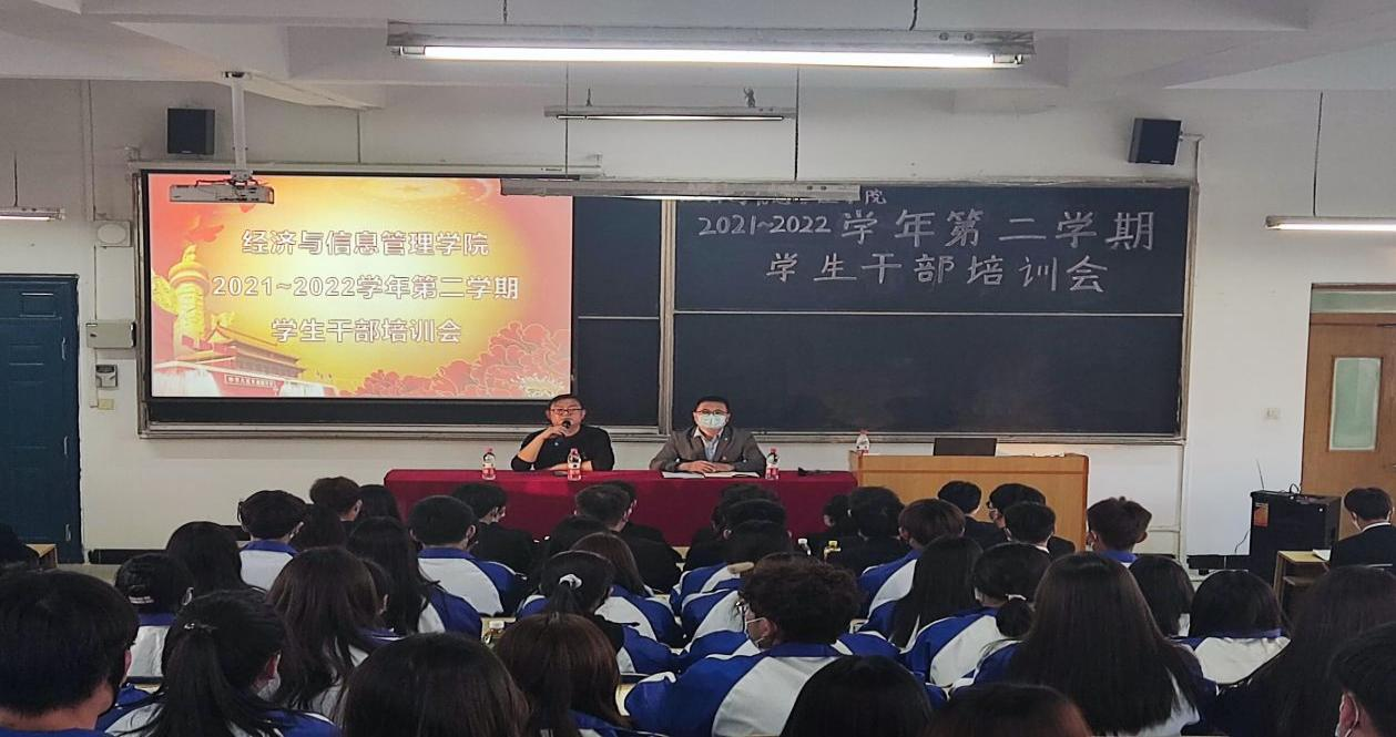 为加强学生干部队伍建设,提升学生干部工作能力和综合素质,更好的发挥学生干部作用,经济与信息管理学院于2022年5月5日晚19点在教学楼东T3教室召开“2021—2022学年第二学期学生干部培训会”。本次培训大会由经济与信息管理学院副院长宋国军及党总支副书记赵磊的主持下召开,学生党员工作站及团学会全体成员参加了此次大会。