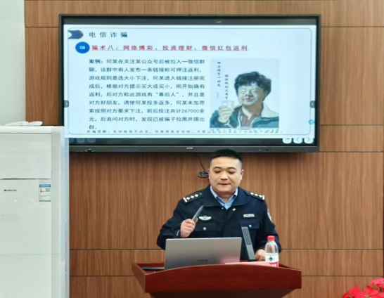 讲座伊始,陈警官结合近期发生的典型案例,强调了电信防范工作在当下校园安全体系中的重要性,还特别提到了常见的电信诈骗手段: 贷款类诈骗、冒充客服类诈骗以及刷单刷信誉等九种常见手段。他详细讲解了每种诈骗类型的作案手法、特点以及识别方法,以通俗易懂的语言让同学们深刻认识到电信诈骗的复杂性和隐蔽性。