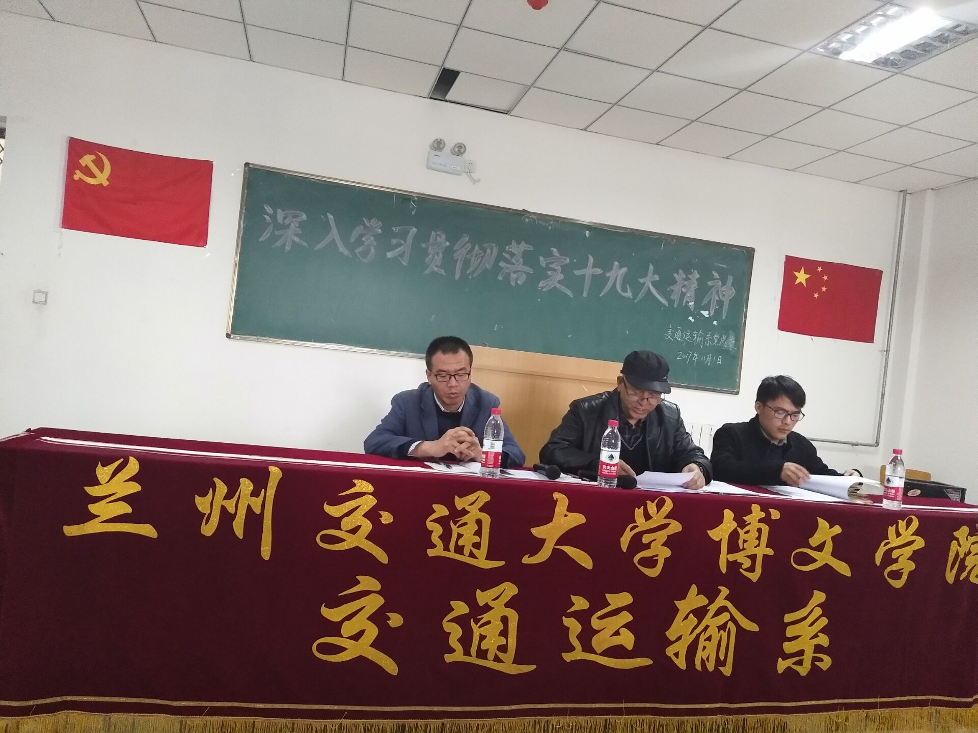 交通运输系党总支于2017年11月1日下午2:30在北校区体育馆206教室组织全体党员、预备党员和积极分子“深入学习贯彻落实党的十九大精神”专题会议。