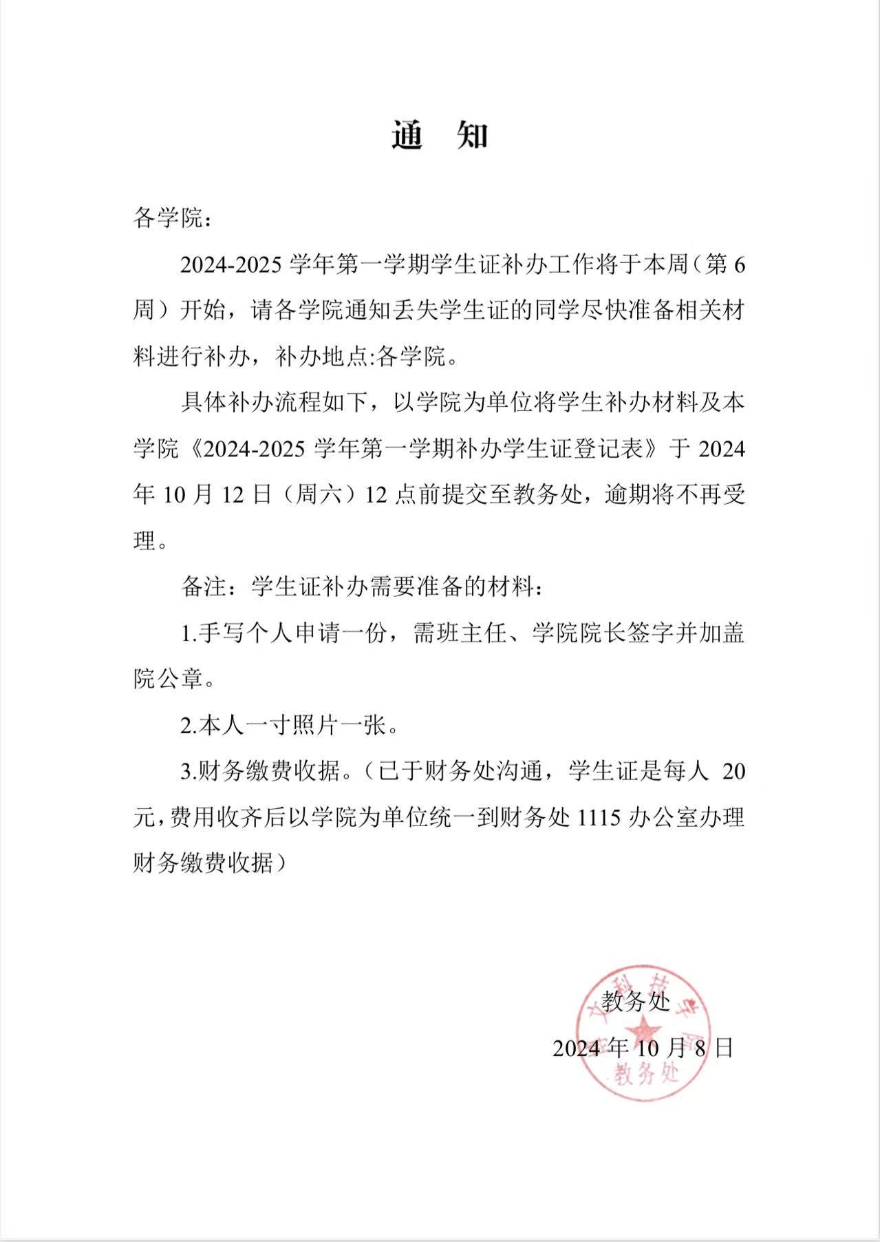 关于2024-2025学年第一学期学生证补办通知