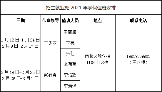 招生就业处2021年寒假值班安排