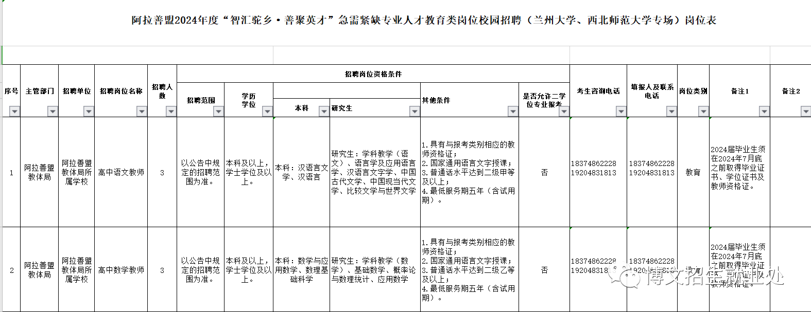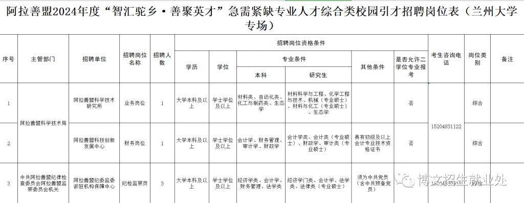 1.阿拉善盟2024年度“智汇驼乡,善聚英才”急需紧缺专业人才综合类校园引才招聘岗位表(兰州大学专场)