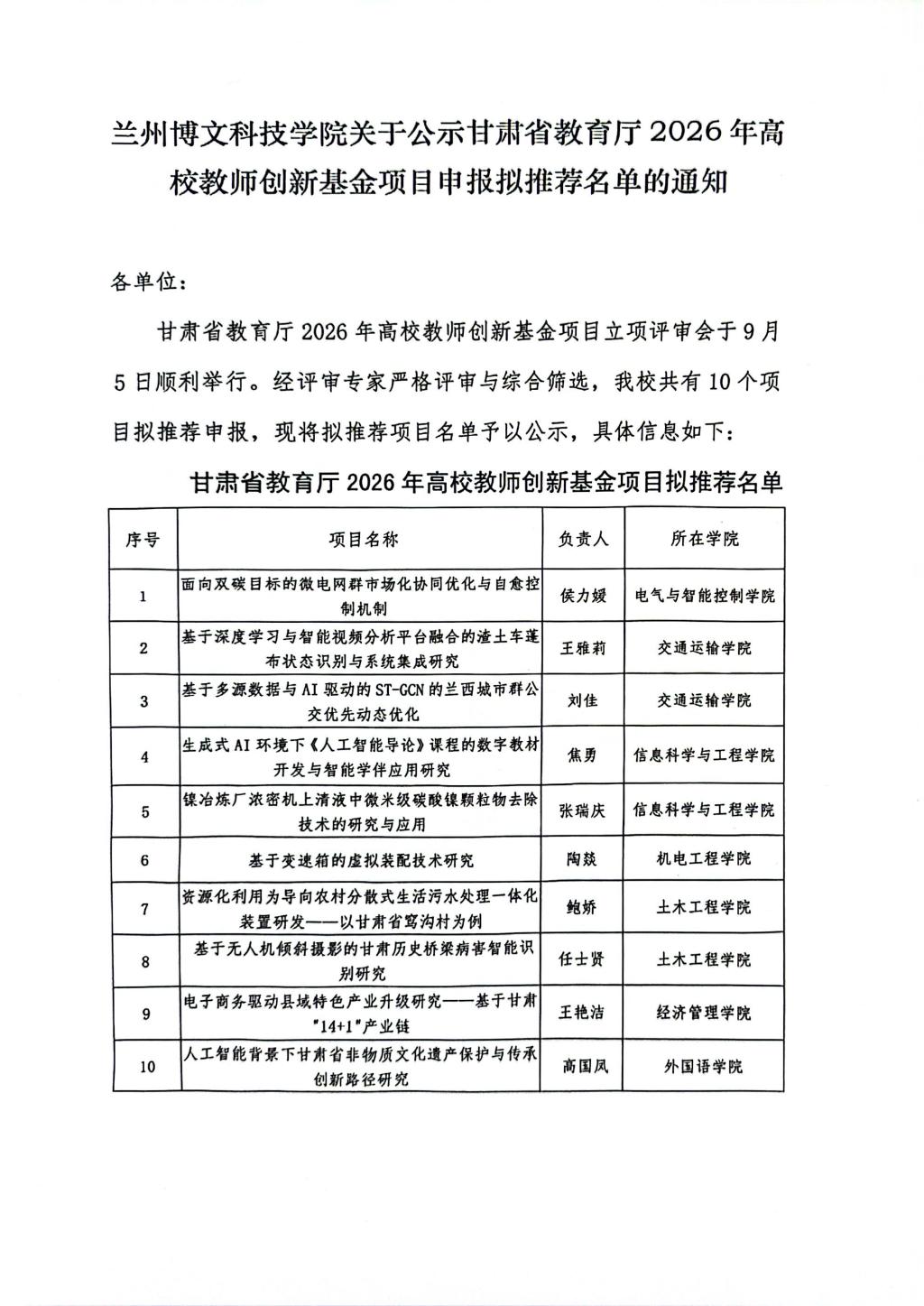 Beat365中国唯一官方网站关于公示甘肃省教育厅2026年高校教师创新基金项目申报拟推荐名单的通知
