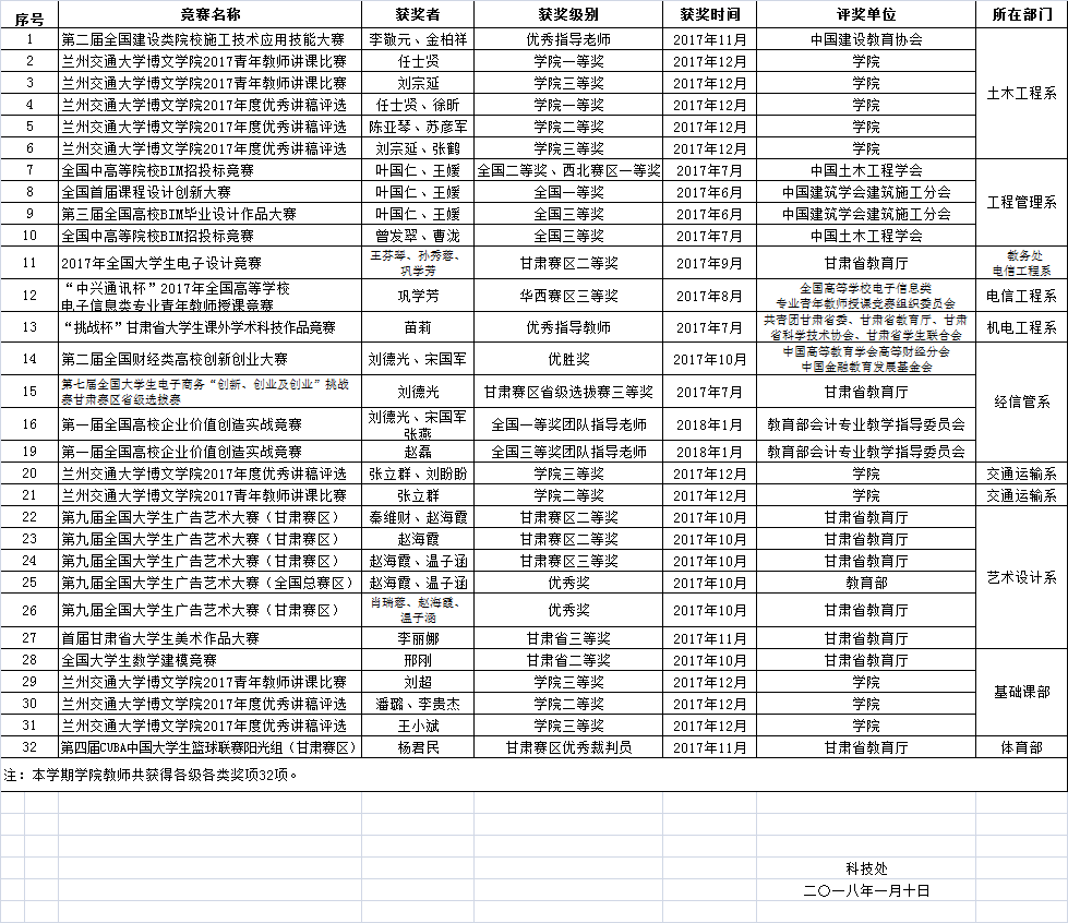 兰州交通大学博文学院2017下半年教师获奖情况统计表