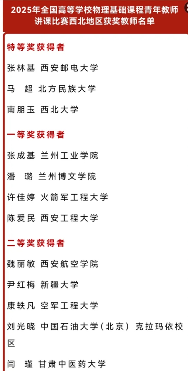祝贺!学校教师荣获全国高等学校物理基础课程青年教师讲课比赛西北赛区一等奖
