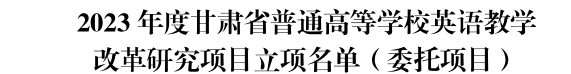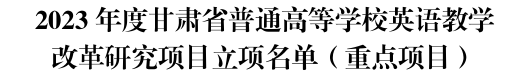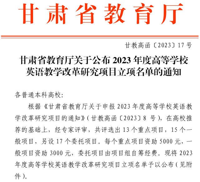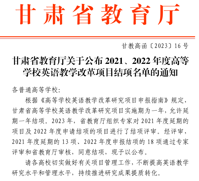 近日,甘肃省教育厅下发了《甘肃省教育厅关于公布2023 年度高等学校英语教学改革研究项目立项名单的通知》(甘教高函〔2023〕17号)和《甘肃省教育厅关于公布2021、2022年度高等学校英语教学改革项目结项名单的通知》文件(甘教高函〔2023〕16号),我校申报的两个项目获批立项,两个项目顺利结项。
