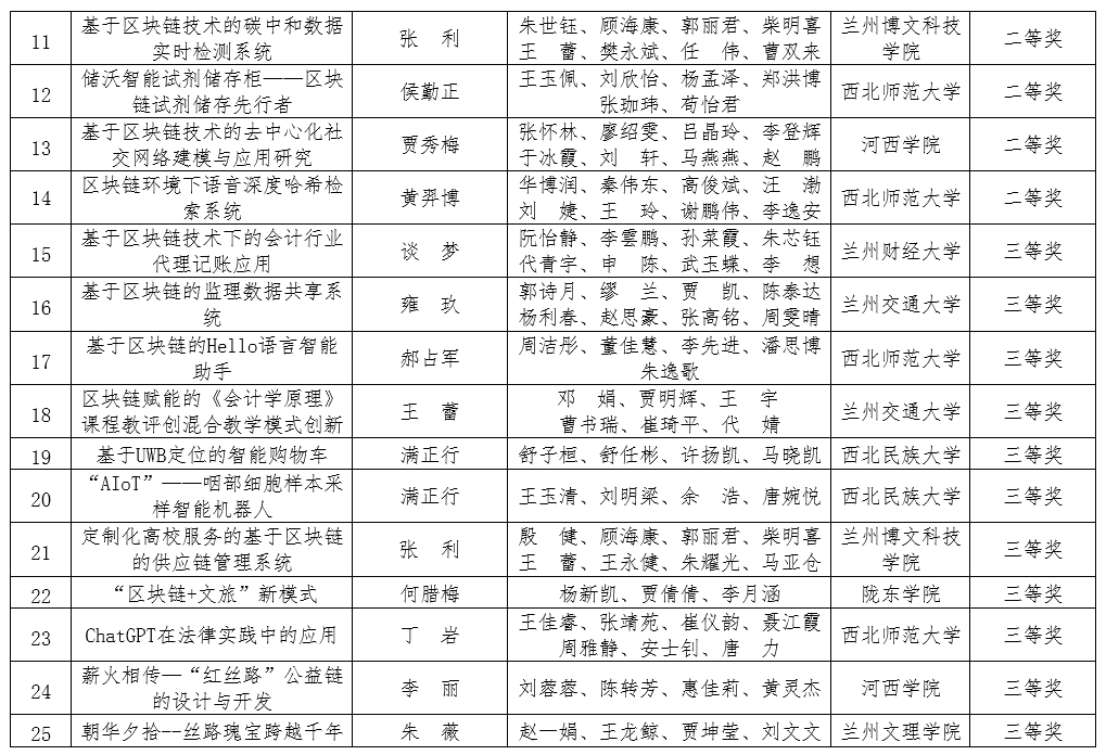 近日,甘肃省教育厅发布了《关于公布甘肃省第三届高校区块链技术应用人才就业创业大赛获奖名单的通知》(甘教学函〔2023〕19号),由我校经济与信息管理学院院长张利带队指导的队伍荣获本届竞赛就业项目赛道(本科组)二等奖和三等奖各一项。