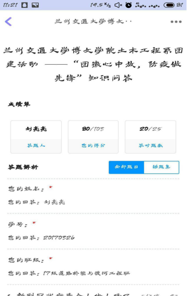 本次知识问答利用问卷星网络平台,采用线上填写问卷的方式开展。问卷聚焦疫情防控知识、传播途径以及防控措施等多个方面,全方位、深层次考察学生对此次疫情防控的了解状况。充分利用互联网的优势,以扫二维码打开页面的方式进行,且实现了多地点、同时间、全覆盖、高参与的防疫知识普及。在参加此次活动之前我们都以为自己已经掌握了疫情防控的知识,但是通过答题还是发现了自己的不足,并且通过这次答题也完善了我们对疫情防控的措施,丰富了防疫知识,使得我们能更好的保护自己,也能保护周围的人。