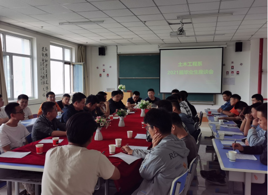 为了进一步了解毕业生的就业、学习和生活情况,掌握毕业生的思想动态,更好地开展毕业生教育、管理和服务工作。土木工程系于2021年6月16日上午10:30,在北校区综合教学楼1007室举行2021届毕业生座谈会。土木工程系主任黄钰峰、教学管理副主任叶国仁、学生管理副主任巩岩、辅导员杨金星以及大四各班学生代表参加了本次座谈会。