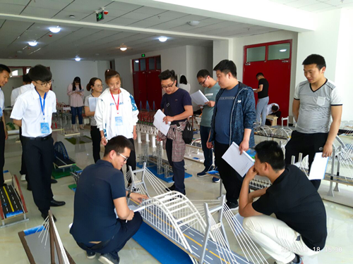 2018年5月18日下午15:00,土木工程系在综合教学楼三楼举行土木工程系第九届桥梁、轨道模型与制作大赛作品评分活动。兰州交通大学博文学院教学副院长胡彦奎、教务处处长王芬琴、土木工程系主任黄钰峰、教学管理副主任李敬元、学生管理副主任王俊鹏以及土木工程系全体教师出席评分活动。