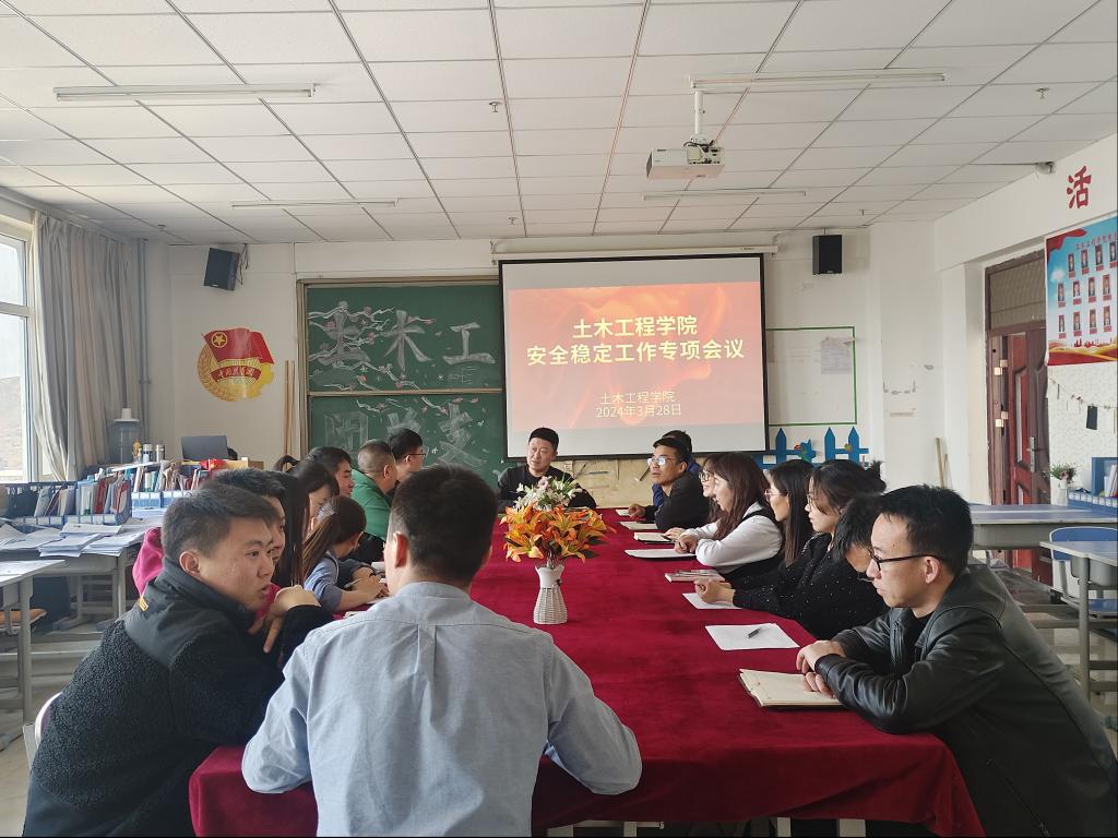 为深入贯彻落实校园安全稳定工作的总体部署要求,按照《Beat365中国唯一官方网站建筑消防安全风险隐患专项整治工作方案》(兰博学发〔2024〕5 号)文件要求及2024年3月27日学校召开的《2024年春季学期百日安全稳定整治工作大会》精神,2024年3月28日土木工程学院组织全体教师召开安全稳定工作专项会议,会议由土木工程学院院长黄钰峰主持。
