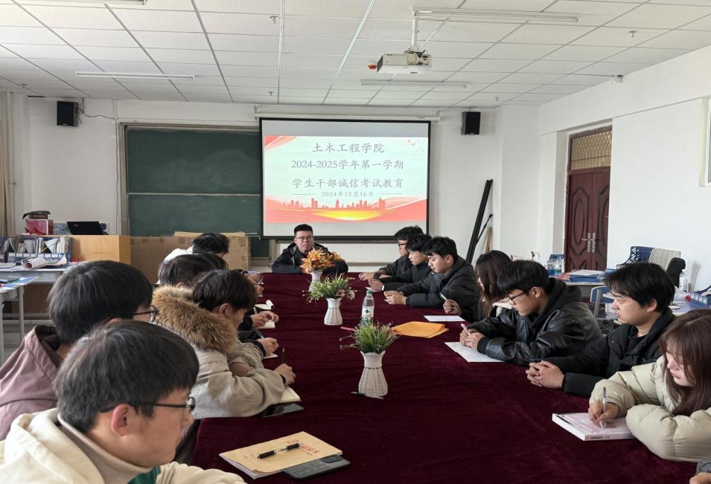为了培养我院学生干部的诚信意识和自律精神,加强学生干部在学生群体中的先锋模范作用,2024年12月16日在综合教学楼1106办公室组织我院学生党员工作站,团学会,创新工作室主席团成员开展了一场以“诚信考试”为主题的诚信考试教育活动,活动由土木工程学院副院长巩岩主持。