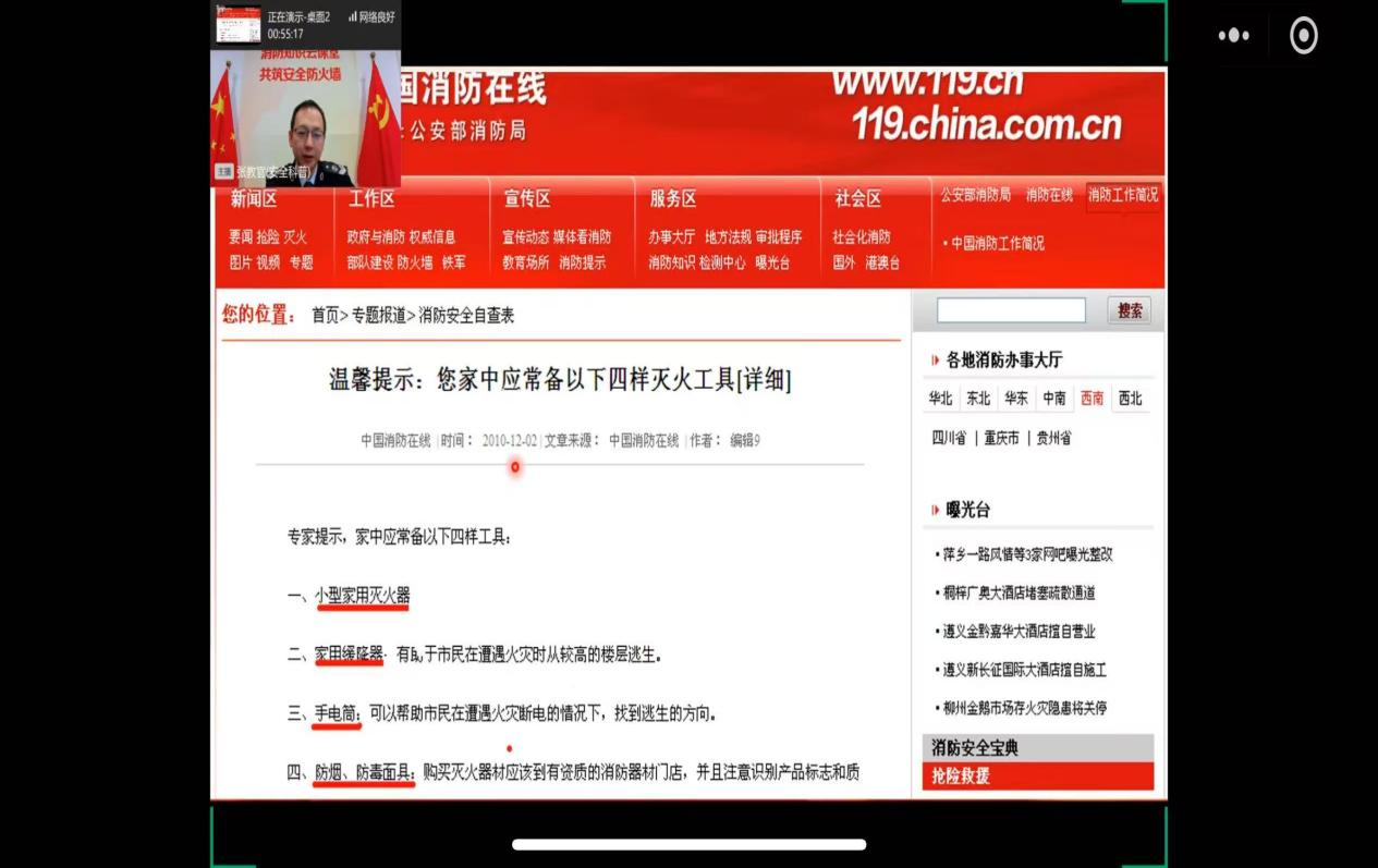 直播过程中,专业讲师结合实际案例,深入浅出地讲解了消防安全的重要性,以及在校园和日常生活中如何预防火灾、应对火灾等知识,还介绍了各类消防器材的使用方法,让同学们对消防安全有了更直观、更深刻的认识。大家表示,通过这次讲座,不仅学到了宝贵的安全知识,更提高了自身的安全意识和自救能力。