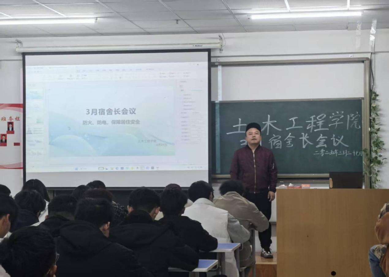 为提升学生的公寓安全意识,预防各类安全事故发生,2025年3月27日19:30,于综合楼1010教室,土木工程学院组织召开以“公寓安全无小事,共同守护你我家”为主题的宿舍长会议,此次会议由辅导员王路清老师主持,土木工程学院21、22、23和24级所有宿舍长参加。