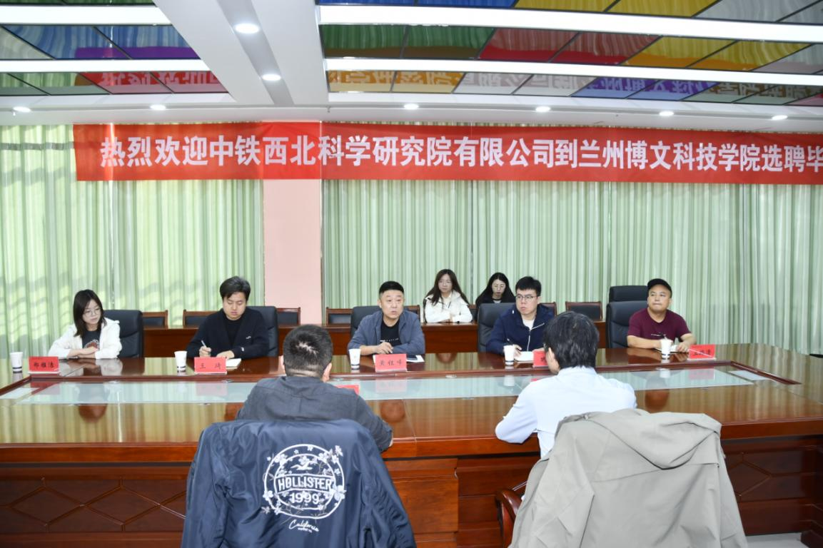 黄钰峰院长对中铁西北科学研究院有限公司到我校开展2026届毕业生专场招聘会表示热烈欢迎期间介绍了我院的发展历程、人才培养、办学特色及近年的毕业生就业状况,并就今后在加强人才培养、双师建设、实习就业等多方面希望通过校企合作方式,为大学生搭建创业平台,拓宽就业渠道,提高学生实践能力,实现双方互利共赢。
