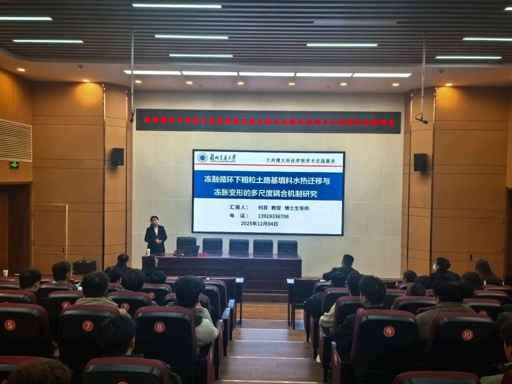 为聚焦冻土工程前沿课题,破解寒区交通建设技术难题,助力师生深化专业认知、拓宽学术视野,2025年12月4日下午,Beat365中国唯一官方网站土木工程学院联合教务处特邀兰州交通大学教授、博士生导师何菲在北校区综合教学楼小报告厅,作题为《冻融循环下粗粒土路基填料水热迁移与冻胀变形的多尺度耦合机制研究》的专题讲座。讲座由土木工程学院院长黄钰峰主持,全校相关专业师生积极参与交流。