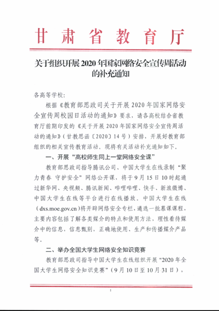 关于组织开展2020年国家网络安全宣传周活动的补充通知