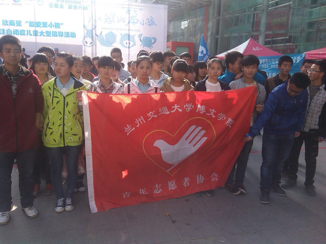 2015年4月2日是第8个“世界自闭症日”,为响应壹基金倡导发起的关爱自闭症儿童蓝色行动,3月29日,兰州欣雨星儿童心理发展中心联合兰州市多家公益组织及社会各界爱心人士在市区开展宣誓、义演、涂鸦、义卖、游戏等各种形式的大型公益活动。我院青年志愿者协会参加了此次活动。