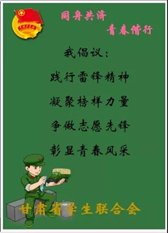 为进一步弘扬在抗击疫情中体现的众志成城、无私奉献、攻坚克难的新时代雷锋精神,在第57个“学雷锋日”(第21个中国青年志愿者服务日)来临之际,甘肃省学生联合会向广大陇原学子发出如下倡议: