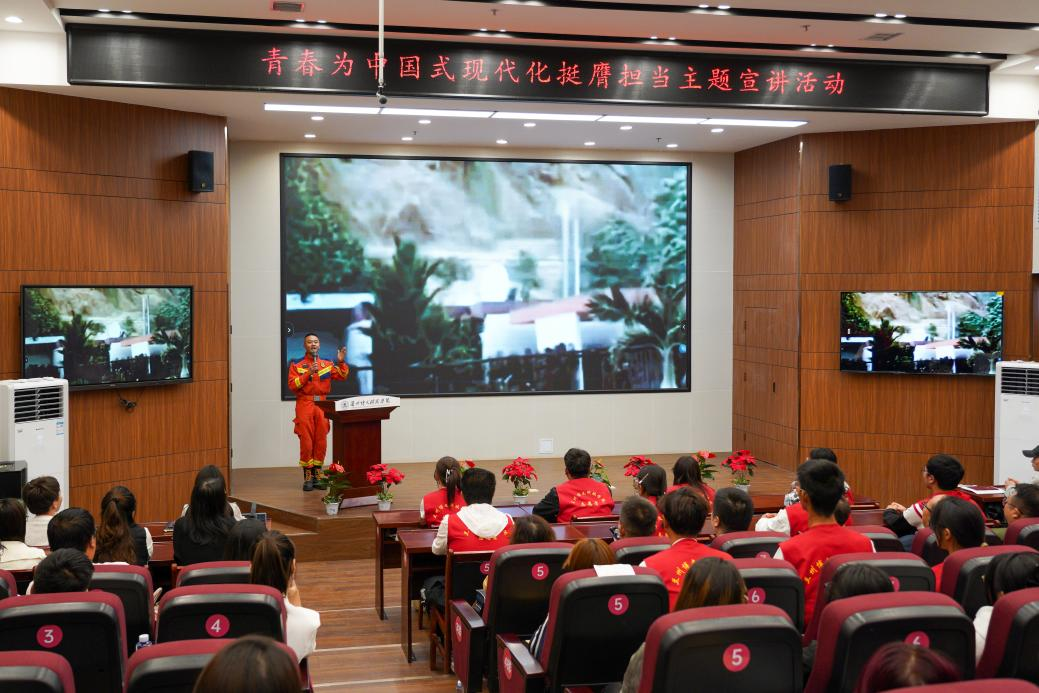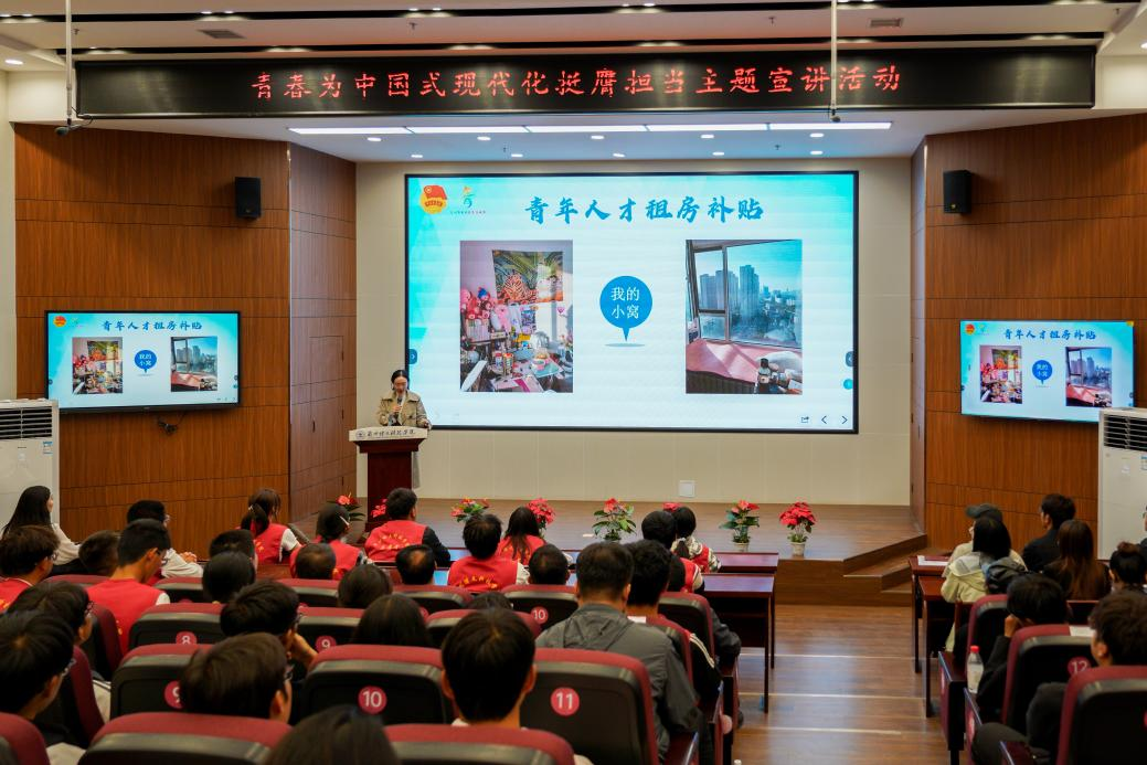 活动在纪录片《青春向光》中拉开帷幕。影片生动展现了当代青年扎根一线、勇担使命的感人瞬间,引发在场师生强烈共鸣。随后,五位来自不同领域的优秀青年代表依次登台,围绕“青春何为、青春何往”这一时代命题,结合自身经历进行了深情宣讲。